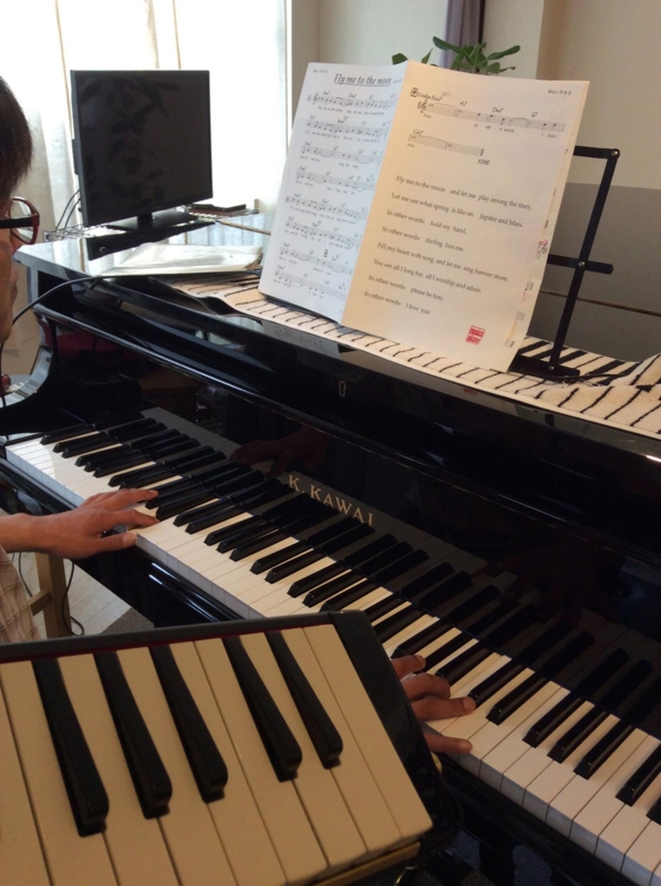 2016-12-10 Fly me to the moon♪ジャムセッションの練習 ピアノレッスン 「Fly me to the moon♪」 ジャムセッション参加に向けての練習。ピアノの生徒さんとわたし、交互にメロディ/コードバッキングを担当。初めのうちはアドリブはおいといて、まずは遅れずにリズムの波にのれるか〜の練習から♪ひとりメトロノームやiReal bアプリでの練習も有効だけど、お互いの息づかいを感じているとなんとなく気合が入る〜というか、 やすんでられないというか、あおられるというか〜(^^)。 ときどき4バースしたり8バースにしたり♪10コーラスくらいはあっという間でした。
